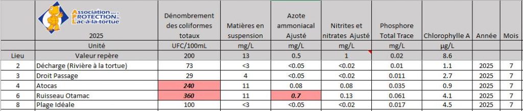 À noter que plus le niveau du lac est bas, plus le brassage de l’eau libère des matières indésirables stockées dans les sédiments. Et que certains endroits sont encore malheureusement très contaminés par les coliformes fécaux.